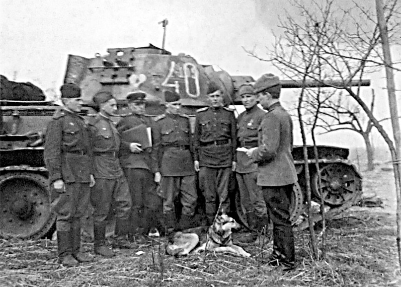 Вручение партбилетов на р. Одер, Германия, апрель 1945 года (крайний справа подполковник Логачёв из политотдела со своей овчаркой)