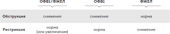 Три перечисленных выше показателя – ФЖЕЛ, ОФВ1 и их соотношение ОФВ1 / ФЖЕЛ будет по-разному меняться при нарушениях обструктивного и рестриктивного типа.