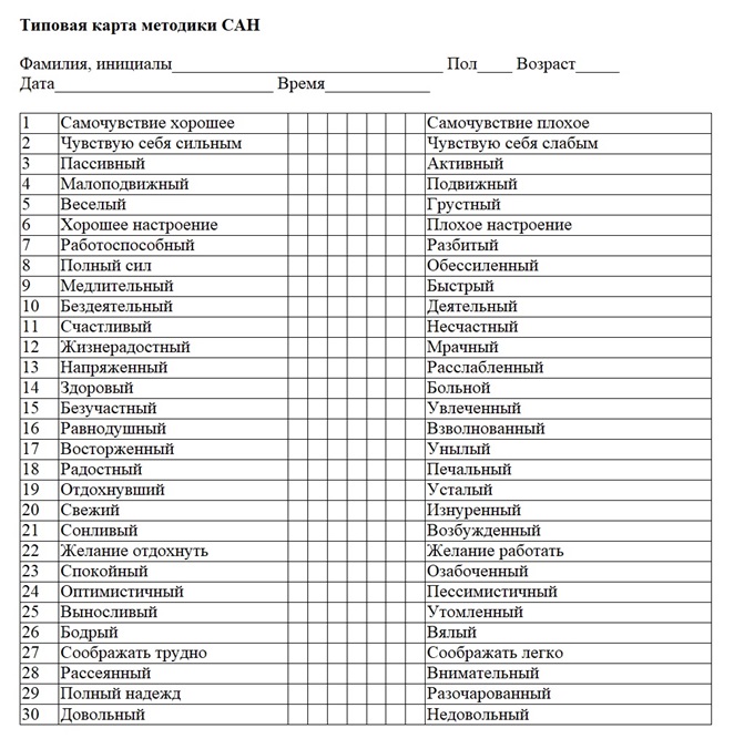 Описание методики САН. Опросник состоит из 30 пар противоположных характеристик, по которым испытуемого просят оценить свое состояние. Каждая пара представляет собой шкалу, на которой испытуемый отмечает степень выраженности той или иной характеристики своего состояния.