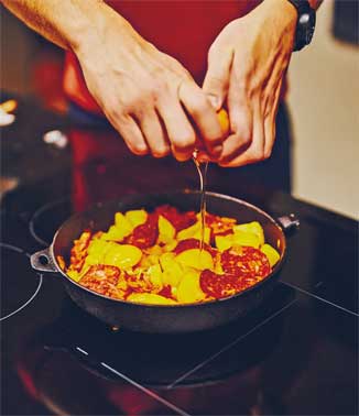 Разогрейте сковороду на умеренно слабом огне. Температура очень важна, потому что, если сковорода будет очень горячей, яйца могут потерять насыщенный желтый оттенок. Масла нужно добавить столько, чтобы дно было полностью им покрыто.
