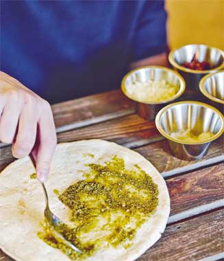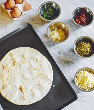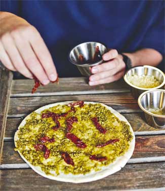 Положите на пиццу тонкий слой песто, затем разложите ровным слоем вяленые томаты, посыпьте все сыром. Сделайте небольшие углубления в слое сыра и разбейте в них яйца.
