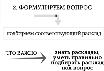 И вторая часть этого этапа. Когда мы сформулировали вопрос, для нас очень важно подобрать соответствующий расклад. В системе существует очень большое количество раскладов, находящихся в определенной иерархии, от самых простых до весьма сложных, комплексных. Есть даже не расклады, а методы, с помощью которых можно сразу моделировать ситуации и искать какие-то разные варианты. Очень важно, чтобы расклад, который мы подбираем, соответствовал вопросу. Расклады бывают диагностические, причинно-следственные, прогнозные, комплексные, моделирующие, бывают даже расклады советующие. В какой-то ситуации можно понять, какая линия поведения, какие поступки являются наиболее целесообразными с точки зрения здравого смысла и отдаленной перспективы. Что здесь для нас важно? Для нас важно изучить большое количество разных раскладов, уметь правильно формулировать вопрос и правильно подбирать расклад под вопрос.