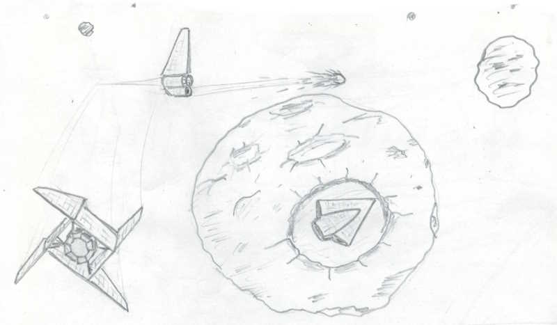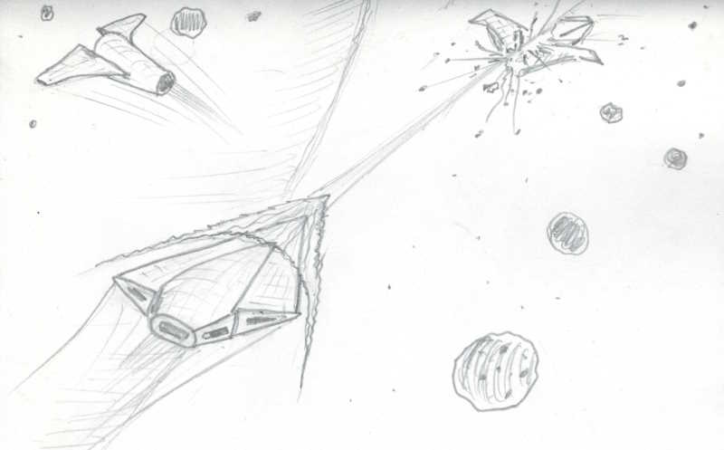 Юркий космолет, похожий на наконечник стрелы или копья, выскочил прямо из-за стремительно затухающей яркой вспышки света, вместо которой раньше был небольшой астероид. Многочисленные мелкие и крупные его фрагменты разлетелись в разные стороны после поражения вольфрамо-бериллиевым шаром пушки Гаусса, как бы пропуская «виновника разрушения» сквозь себя в образовавшееся пустое пространство космоса. Вспыхнувший ярко-оранжевым контур плазмо-щита на передней полусфере космолета из-за стремительного разгона вмиг распылил замешкавшиеся фрагменты некогда крупного астероида. По сути догнать собственный снаряд пушки Гаусса едва не в момент его попадания по цели было своего рода визитной карточкой того, кто виртуозно, иногда на грани, управлял этим космолетом.