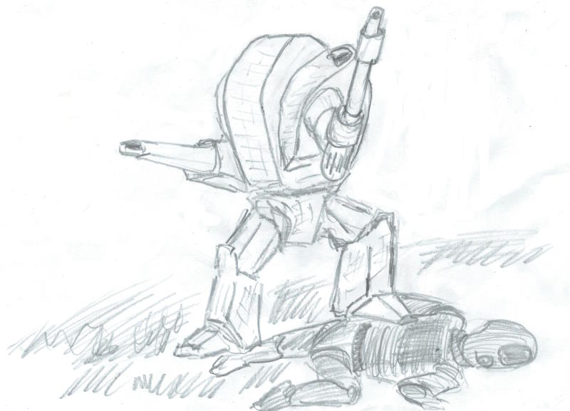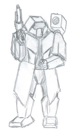 Над ним нависало массивное тело в 2.5 метра ростом, закованное в очень толстую пехотную броню. На локтях обеих рук были прицеплены мощные орудия, способные противостоять даже боевым машинам, космолетам и роботам. Дуло импульсного мега-ватного лазера уперелось ему прямо в спину в том месте где стояла массивная бронированная ступня. Вторая рука приподнялась вверх сверкнув дулом легкой роторной пушки.