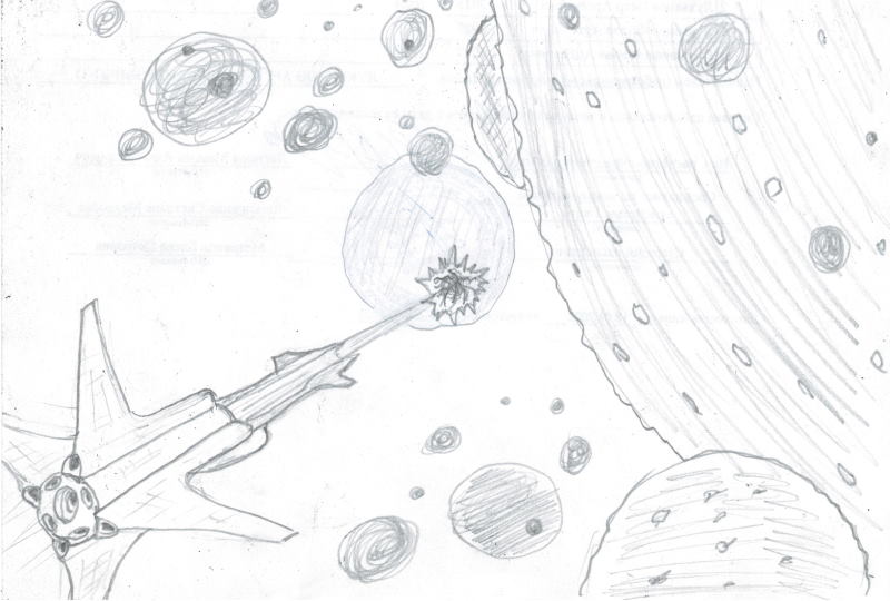 На мгновение 95-тысячетонная «туша» крейсера как бы замерла в пространстве в предельно допустимой близости от приближающегося планетоида, покрытого множеством камней-спутников больших и малых, как роем мошек, вьющийся вокруг. Из жерла на «острие меча» стремительно вылетел черный шар, покрытый всполохами электро-разрядов и окутанный ярким ореолом газообразной плазменной оболочки. Этот шар стремительно полетел в сторону планетоида, «расталкивая» камни поменьше, и теряя по пути свою защитную «корку» из плазмы. Через несколько секунд он полностью исчез из сенсоров корабля заменив себя «белым шумом» помех на проекции в командном отсеке.