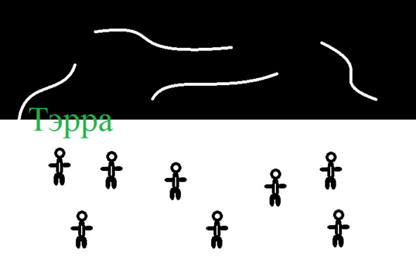 Артём был программистом. Рослый, кучерявый парень 25-ти лет. Делал он сайты, а в свободное от работы время занимался он моделированием процессов на компьютере. Его программа Тэрра задумывалась, как простая игра: черный верх, белый низ. Маленькие черные человечки – «люди» – в этой игре сами давали названия животным типа Алеф5, что значило бык 5 лет. Белые змеи ходили в этой игре по черному небу.