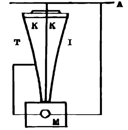 Рисунок 3.4. Вариант «аппарата Эдисона», полученный Райтом и Гарднером, где T – корпус, A – антенна, I – внутренний электрод, M – микрофон, K – раствор перманганата калия