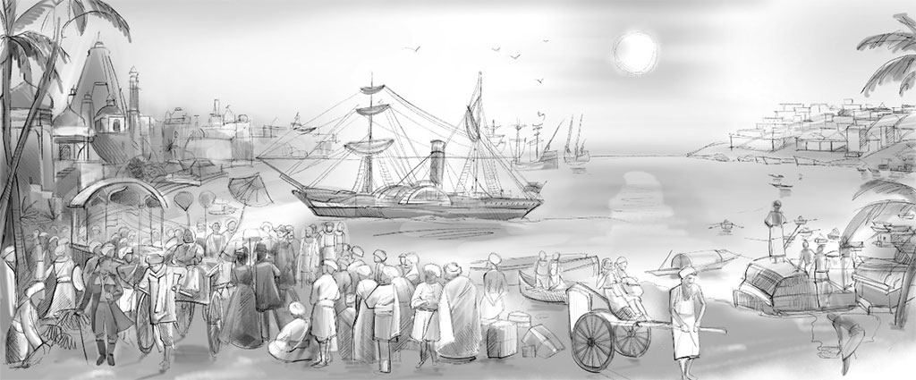 Порт Бомбея. УтроКакое же счастье вновь ощутить твёрдую землю под ногами! Особенно когда ты её не чувствовал на протяжении двух недель. Путешествие по морю на небольшом пароходе среди бескрайних морских просторов, где твоя жизнь лишь в руках Господа и команды, – то ещё испытание для истинных любителей моря и крепких желудком людей. Жар, нестерпимый, как раскалённая сковорода, обжёг лицо, и вихрь тысячи ароматов – пряных, сладких, гнилостных – ударил в нос, как только Эрнест перешагнул через порог своей каюты на залитую ярким индийским солнцем палубу. Судно подошло к пирсу.