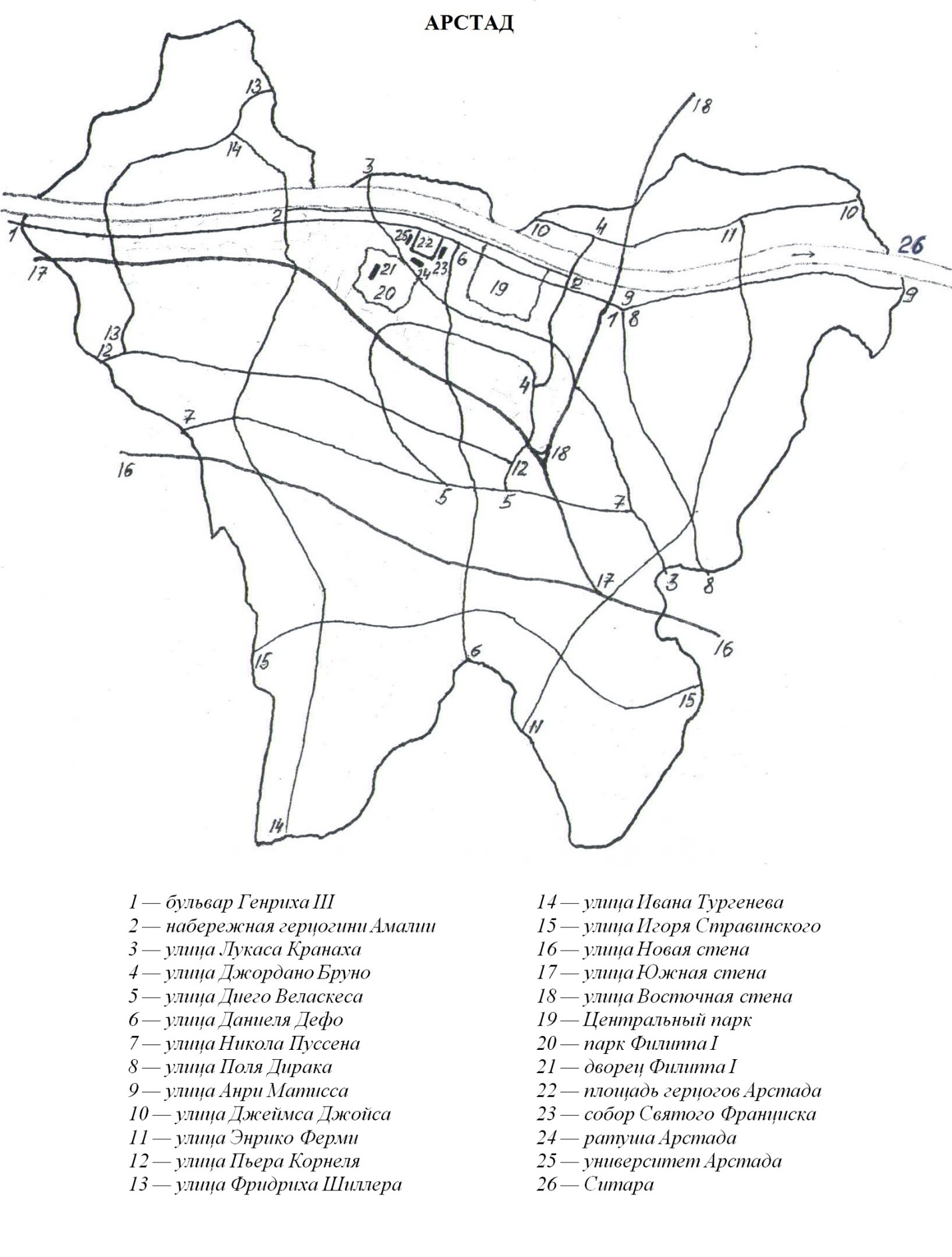 А современный Арстад – это четвертый по величине город в Сантории, с населением чуть больше двухсот тысяч человек. Расположен он в пятнадцати километрах от западной границы, на южном берегу Ситары и в ущелье гор, в частности между двумя самыми высокими вершинами местности – Большой и Малой Волчицами. В настоящее время Арстад – это, в первую очередь, главный туристический центр страны, как Санторин – финансовый, Каст – культурный, а Мэйвертон – научный. По всему городу, но главным образом в южной его части, разбросано огромное количество отелей, санаториев, профилакториев, туристских и спортивных баз, наряду с кинотеатрами, кафетериями, барами, ресторанами и прочими развлекательными заведениями. Исторический же район – Старый город, – представляет собой территорию, максимально приближенную к той, какую занимал Арстад в шестнадцатом – восемнадцатом столетиях. Как и должно было быть, застраивался город вдоль берега Ситары и дальше к югу, все более сужаясь к западу в прибрежную полосу, и максимально расширяясь на востоке, где находился под защитой восточной крепостной стены. К концу девятнадцатого века городские стены были полностью снесены, но для сохранения границ исторического центра, а также для удобства административного деления, правительство города решило проложить в Арстаде три основных улицы – своего рода внутренние границы. И не прибегая к особой оригинальности назвали их Южная стена, Восточная стена и Новая стена (новая, потому что на самом деле никакой стены на этом месте ранее не существовало). Еще одной особенностью Арстада можно назвать практическое отсутствие прямых улиц, а самой оригинальной в этом плане считается улица Диего Веласкеса, которая почти замыкает саму себя по неправильной окружности.