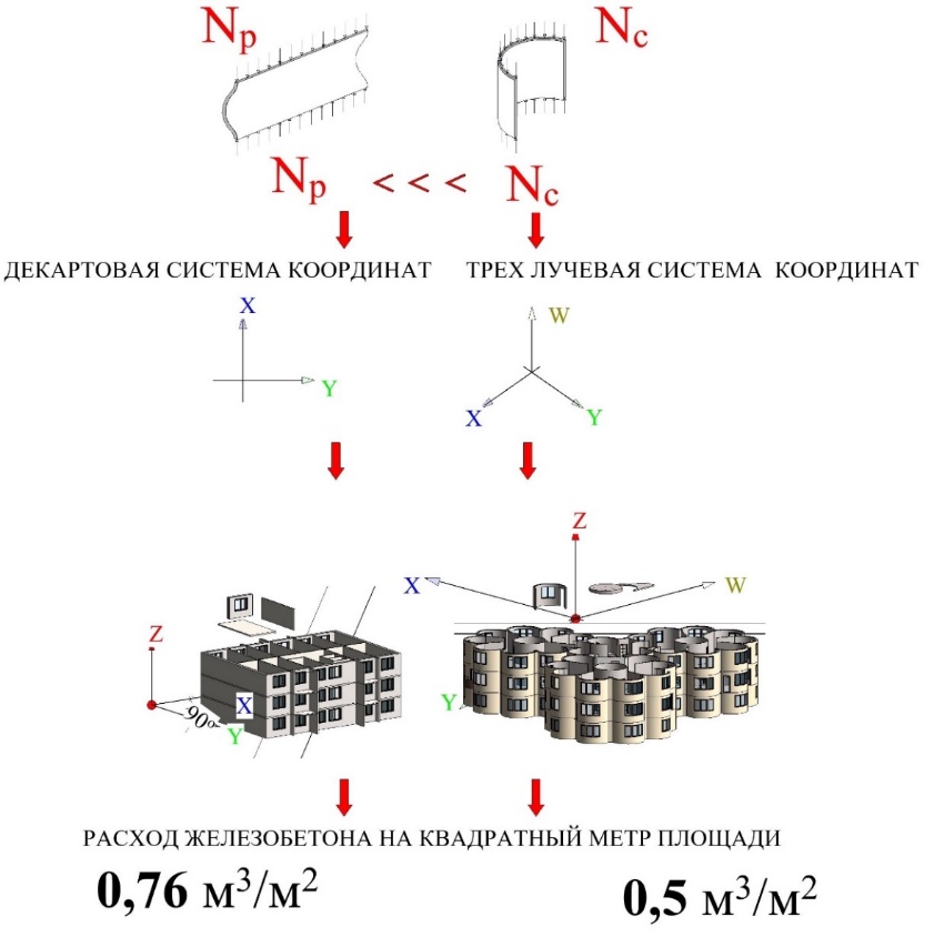 В Декартовой системе координат самой простой формой является коробчатый элемент, поэтому все крупнопанельные здания – это коробчатая структура. Криволинейные стены не вписываются в систему декартовых координат, но применимы в трёх лучевой системе. При этом, вместо коробчатой структуры, мы получаем совсем другого типа оптимальную конструкцию в виде трилистника.