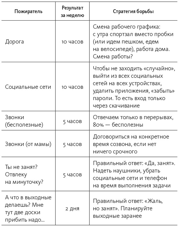 Итак, пожиратели обозначены. Понятно, сколько времени они крадут. Не все они наши лютые враги. Некоторые неизбежны (например, логистика). Некоторых мы любим (маму, жену, детей). Поэтому давайте без радикальных решений, если только дело не касается соцсетей или сериалов.