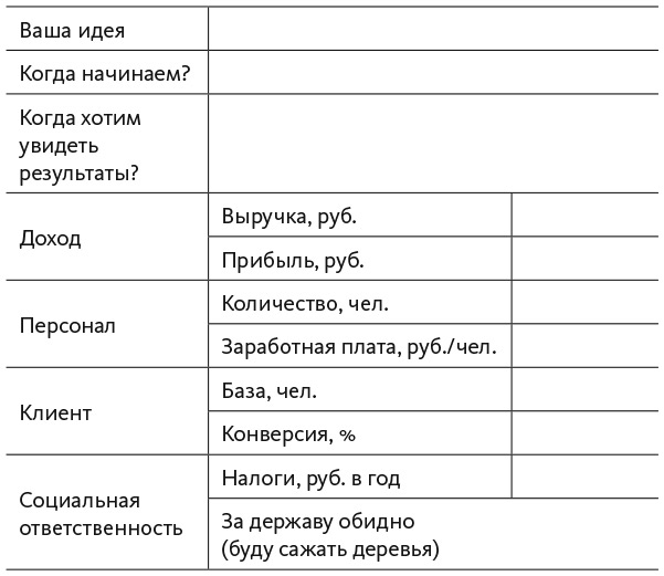 • На что потратите деньги? Обычно все заканчивается на уровне «машина, квартира и шуба жене (себе)». Заполняем следующую таблицу (табл. 1.5). Крайне важно понимать, сколько денег и для каких целей вам необходимо.