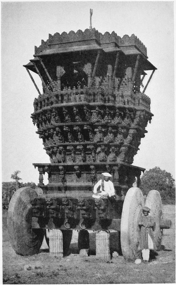 Çoğu ilaha ibadette önemli bir gün diğer ilahları ziyaret törenidir ve taşınmaları için gösterişli araçlar gerekir. Tekerlekleri taştan olan bu araba Hint ahşap oymacılığının inceliğini göstermek üzere seçilmiştir.