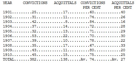 It is quite true that juries, for rather obvious reasons, are more apt to acquit in murder cases than in others. In the first place, save where the defendant obviously belongs to the vicious criminal class, a jury finds it somewhat difficult to believe, unless overwhelming motive be shown, that he could have deliberately taken another's life. Thus, with sound reason, they give great weight to the plea of self-defence which the accused urges upon them. He is generally the only witness. His story has to be disproved by circumstantial evidence, if indeed there be any. Frequently it stands alone as the only account of the homicide. Thus murder cases are almost always weaker than others, since the chief witness has been removed by death; while at the same time the nature of the punishment leads the jury unconsciously to require a higher degree of proof than in cases where the consequences are less abhorrent. All this is quite natural and inevitable. Moreover, homicide cases as a rule are better defended than others, a fact which undoubtedly affects the result. These considerations apply to all trials for homicide, notorious or otherwise, the results of which in New York County for ten years are set forth in the following table: