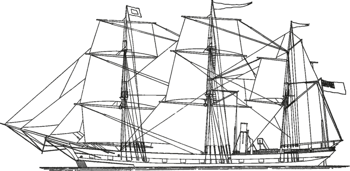 Схематическое изображение судна «Надежда», построенного фирмой «Александр Холл и Компания» в Абердине, «в период процветания фирмы и расцвета ее славы как едва ли не самой успешной кораблестроительной компании в мире». (Бэзил Лаббок «Арктические китобойные суда», Глазго, 1957).