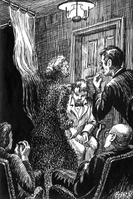 Все молчали. Зазвучала музыка. Портьеры заколыхались – кто-то пытался выйти из кабинки, но миссис Линден, вскочив со стула, воспрепятствовала этому. Медиум впервые за весь сеанс зашевелился в кресле и застонал.