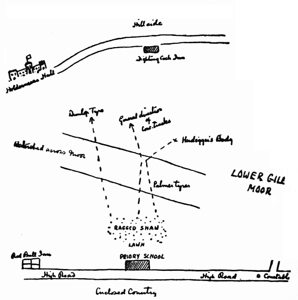 "Look at this map. This dark square is the Priory School. I'll put a pin in it. Now, this line is the main road. You see that it runs east and west past the school, and you see also that there is no side road for a mile either way. If these two folk passed away by road, it was this road."