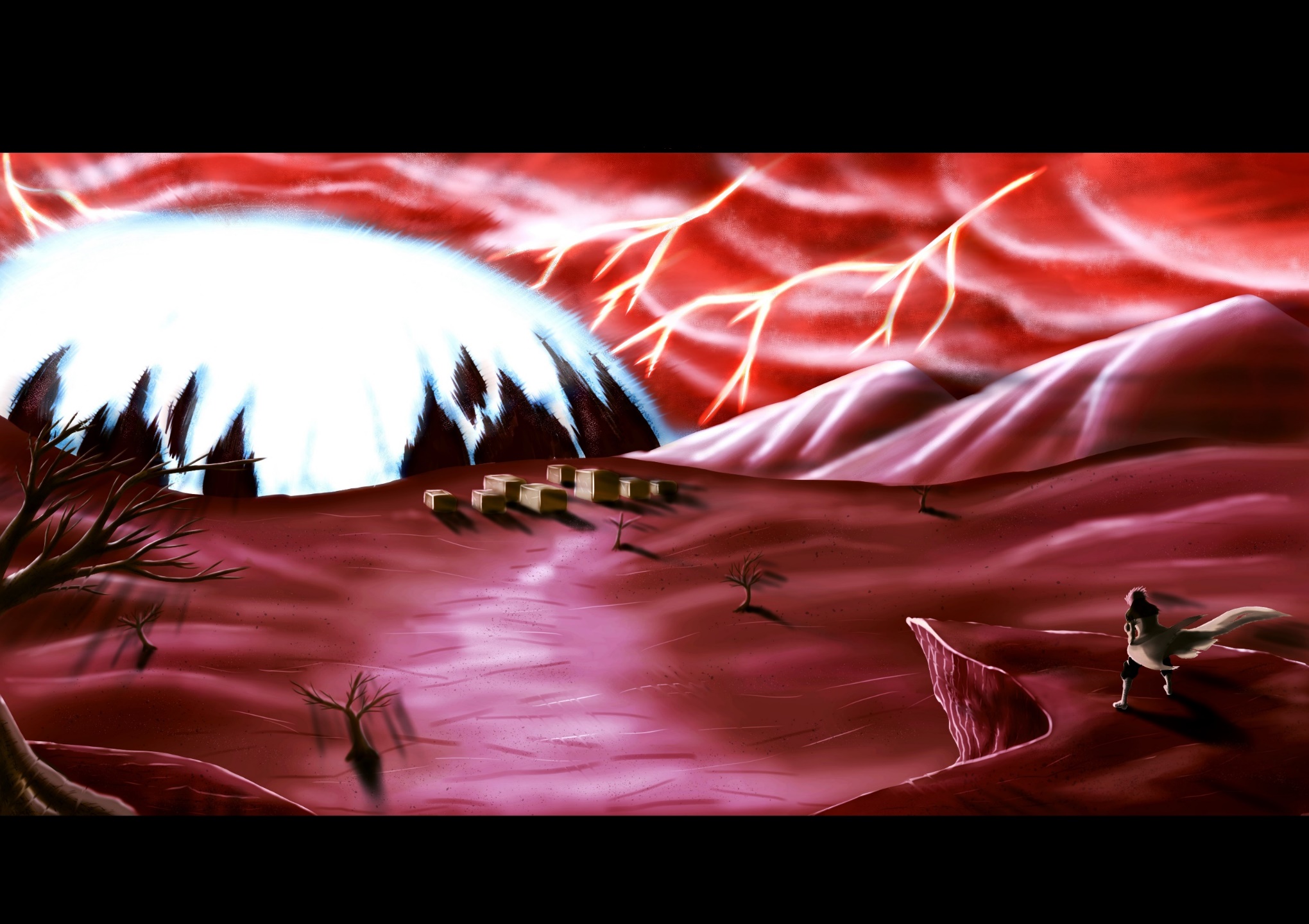 В тот день передо мной на мгновение весь мир как будто замер. Среди багрово-красных безжизненных земель и пустынь не сдвинулась ни одна песчинка. Ветви иссохших немногочисленных деревьев не издавали ни единого треска. А тёмные бардовые облака, затягивающие весь небосвод, обычно переполненные разрядами молний, находились в полном спокойствии.