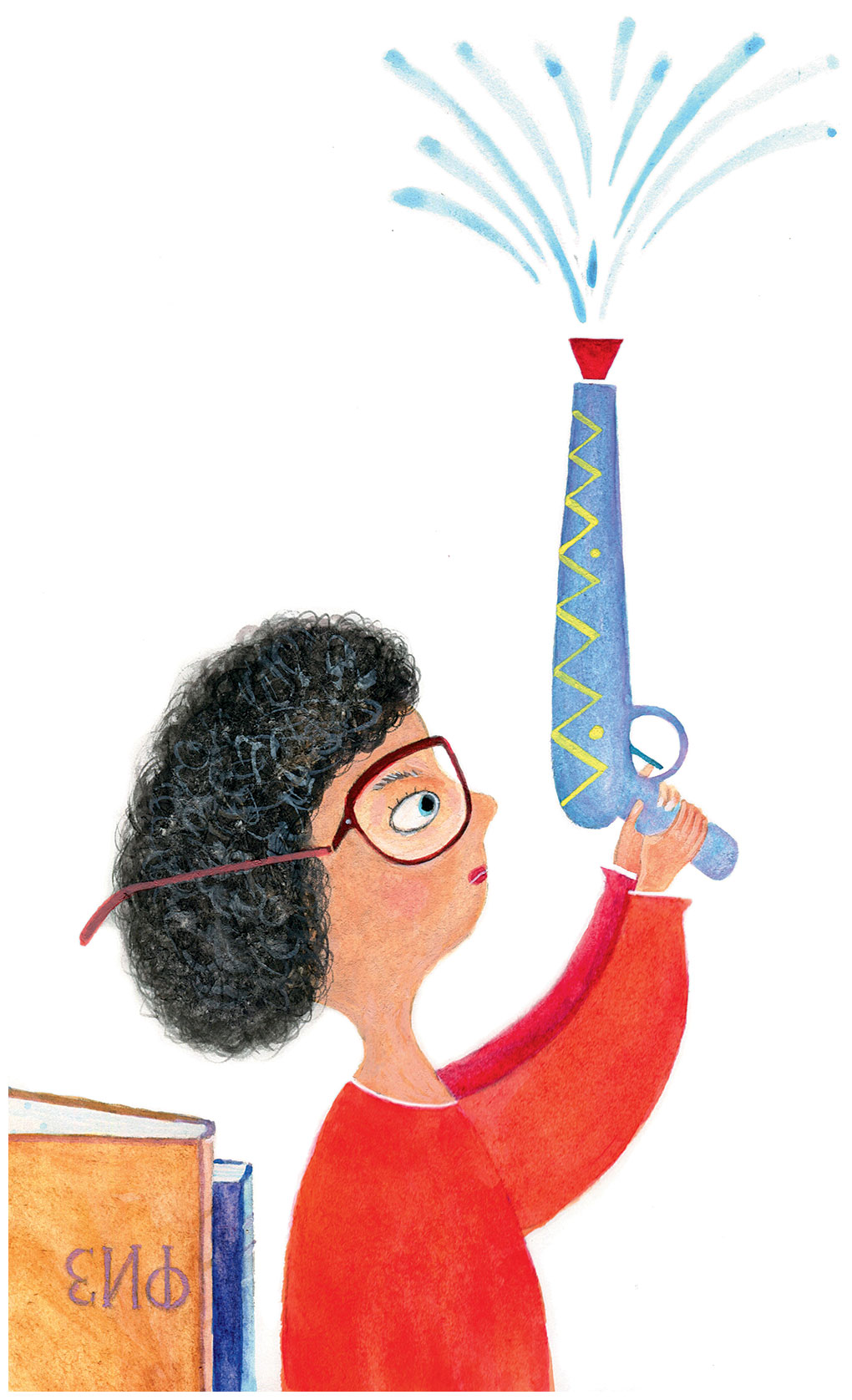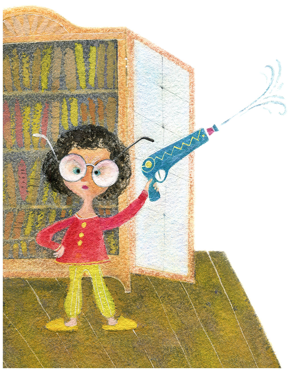 Она взяла водяной пистолет и стала ходить вокруг книжного шкафа.