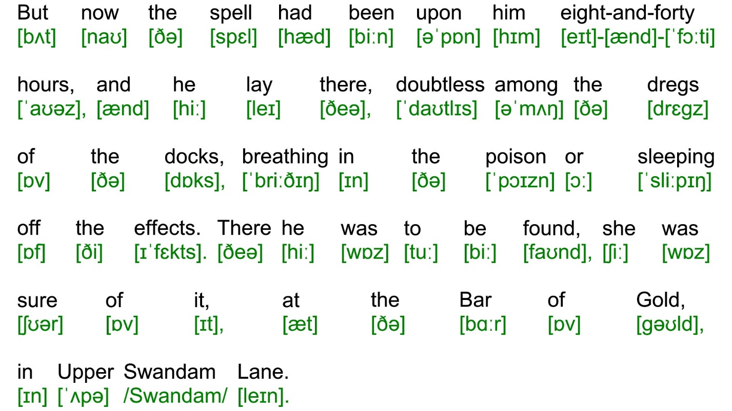 But now the spell had been upon him eight-and-forty hours, and he lay there, doubtless among the dregs of the docks, breathing in the poison or sleeping off the effects. There he was to be found, she was sure of it, at the Bar of Gold, in Upper Swandam Lane.