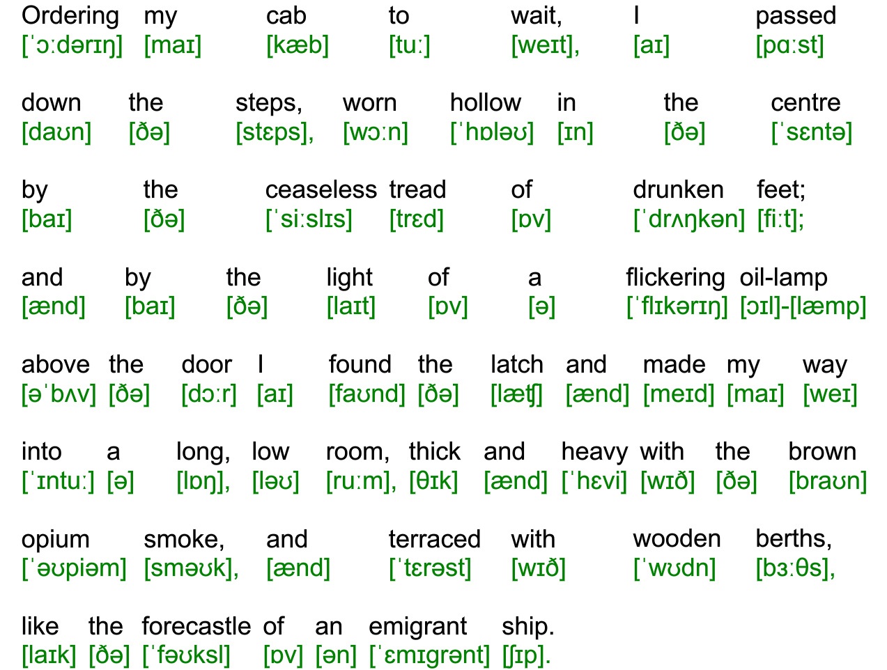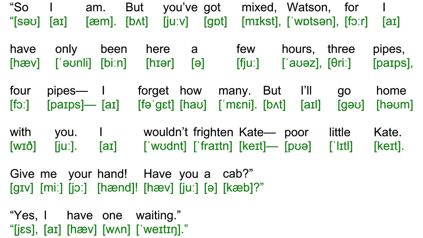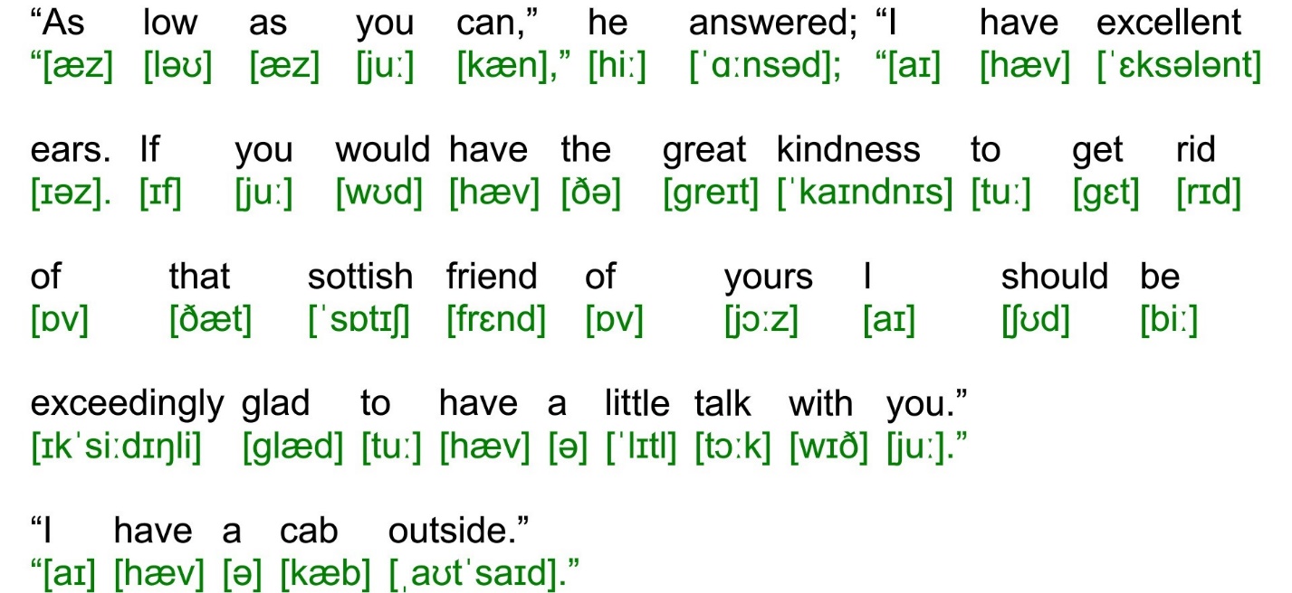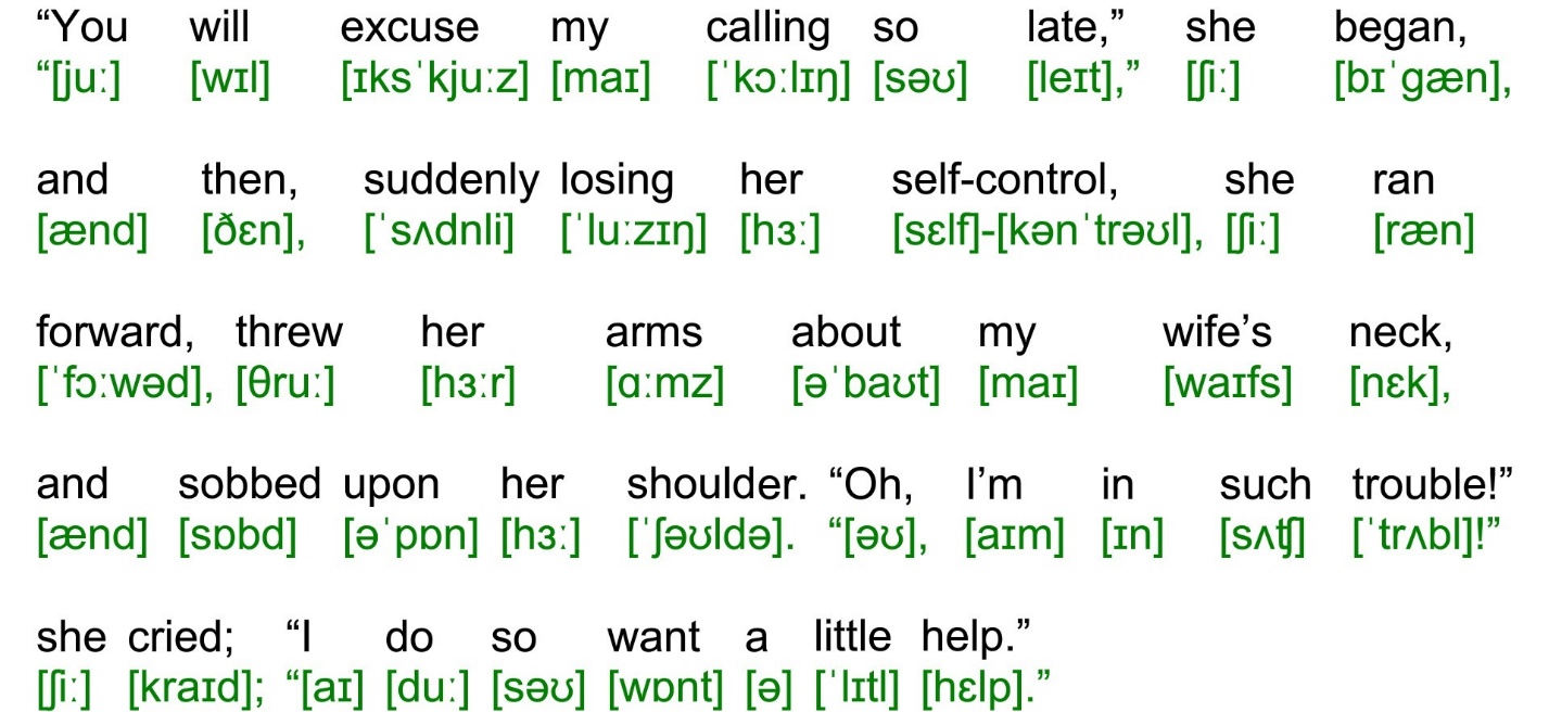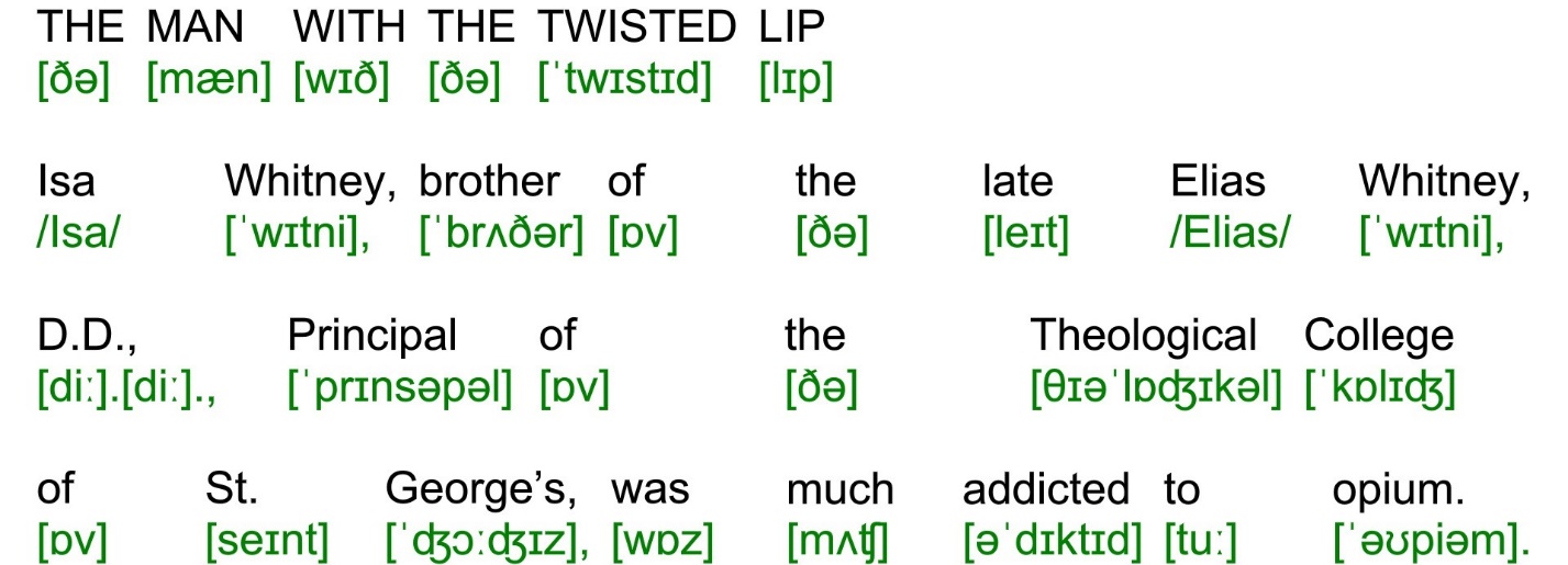 В данной книге приводится текст рассказа А.К. Дойла «Человек с рассечённой губой» на английском языке с транскрипцией. Текст рассказа разбит на небольшие фрагменты. Для каждого фрагмента подготовлена транскрипция, оформленная в виде иллюстрации с изображением транскрипции текста фрагмента. Фрагменты пронумерованы порядковыми номерами (001, 002,…,245). Для каждого фрагмента создан видеоролик – презентация данного фрагмента. Адрес видеоролика приведён после номера фрагмента. С видеороликами можно работать как в режиме on-line, так и в режиме off-line, предварительно скачав их. Адрес папки с видеороликами: