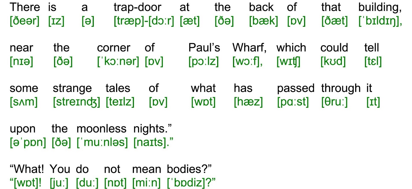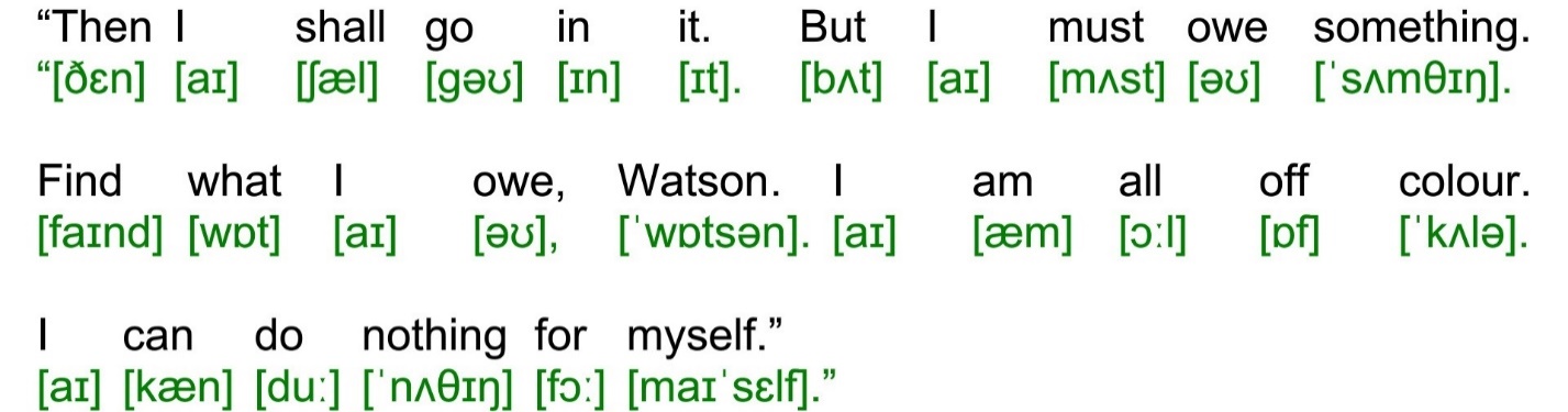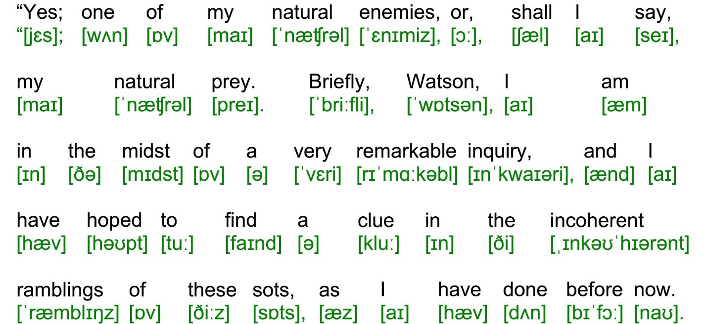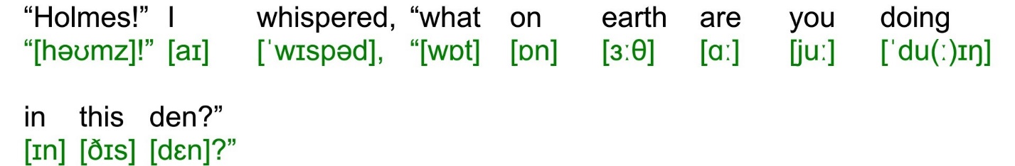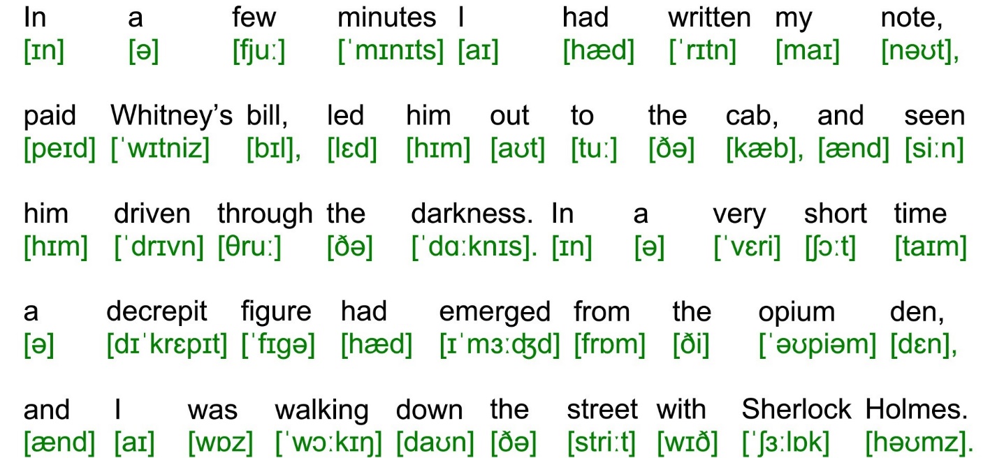 Для подготовки видеоролика использована бесплатная аудиокнига с публичного сайта Librivox (https://librivox.org/the-adventures-of-sherlock-holmes-version-4-by-sir-arthur-conan-doyle/), озвученная носителем языка (David Clarke), и бесплатная электронная книга с публичного сайта Project Gutenberg (http://www.gutenberg.org/ebooks/1661). Транскрипция, записанная символами международного фонетического алфавита, выполнена с помощью онлайн-переводчика английского текста в транскрипцию. Автор онлайн-переводчика – Дмитрий Янс (https://tophonetics.com/ru/).