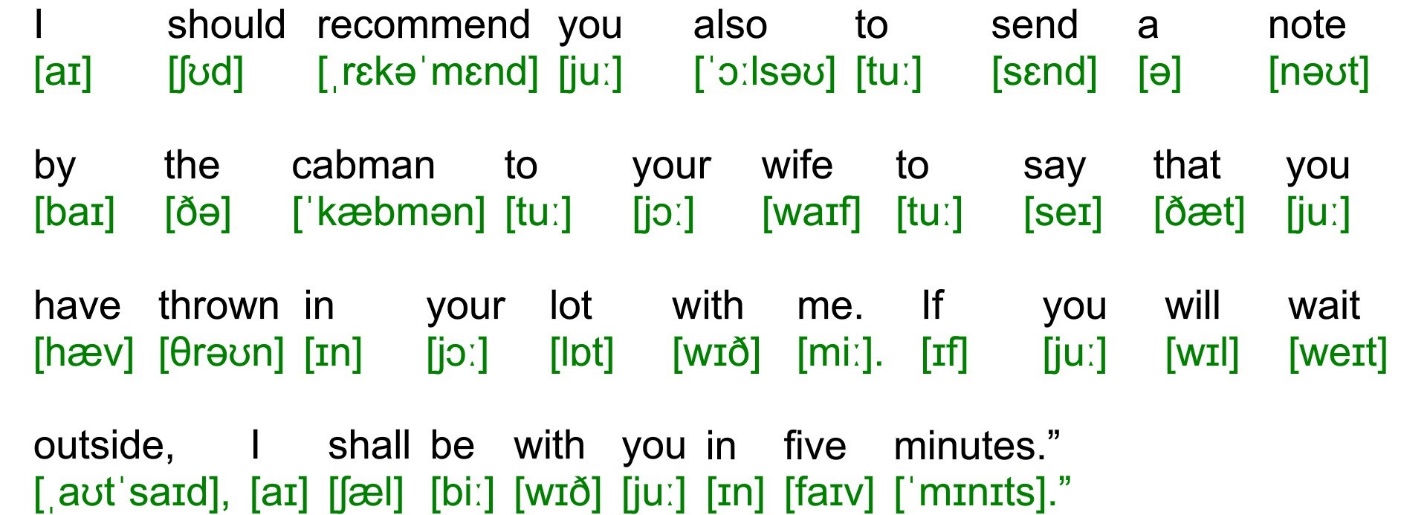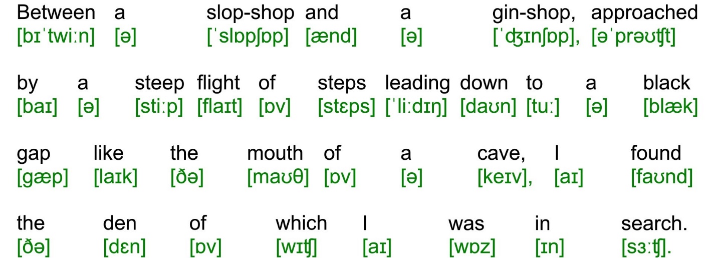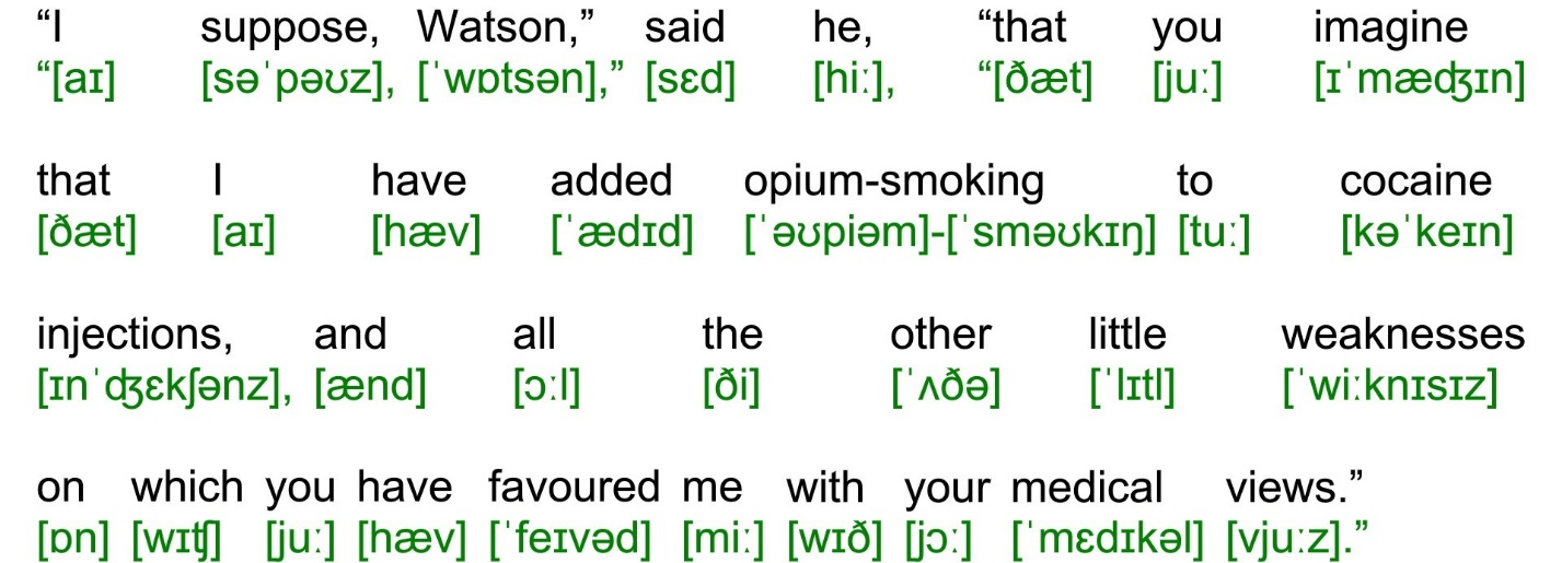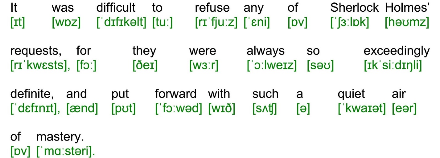Для подготовки видеоролика использована бесплатная аудиокнига с публичного сайта Librivox (https://librivox.org/the-adventures-of-sherlock-holmes-version-4-by-sir-arthur-conan-doyle/), озвученная носителем языка (David Clarke), и бесплатная электронная книга с публичного сайта Project Gutenberg (http://www.gutenberg.org/ebooks/1661). Транскрипция, записанная символами международного фонетического алфавита, выполнена с помощью онлайн-переводчика английского текста в транскрипцию. Автор онлайн-переводчика – Дмитрий Янс (https://tophonetics.com/ru/).