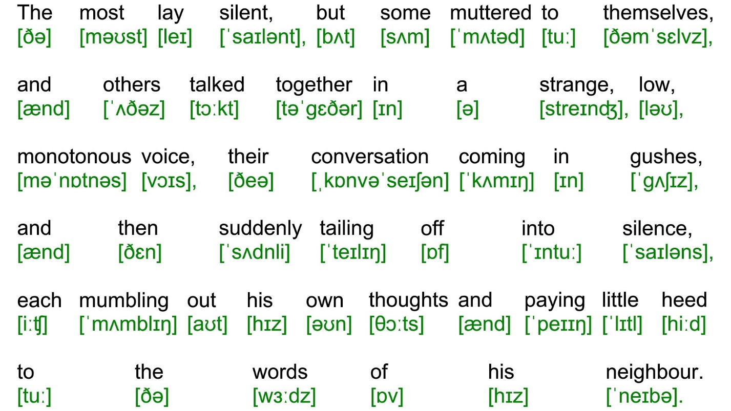 The most lay silent, but some muttered to themselves, and others talked together in a strange, low, monotonous voice, their conversation coming in gushes, and then suddenly tailing off into silence, each mumbling out his own thoughts and paying little heed to the words of his neighbour.