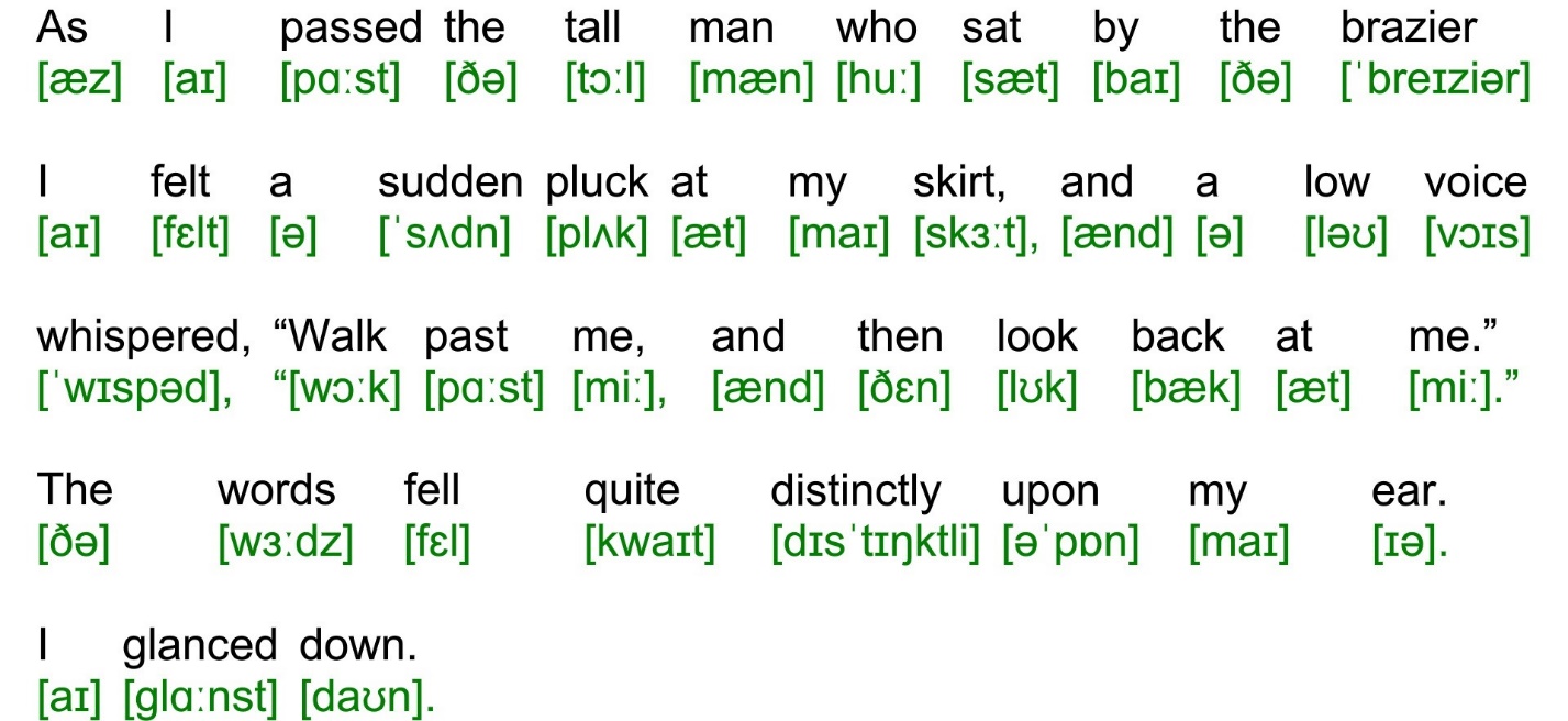 As I passed the tall man who sat by the brazier I felt a sudden pluck at my skirt, and a low voice whispered, “Walk past me, and then look back at me.” The words fell quite distinctly upon my ear. I glanced down.