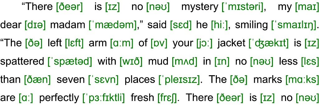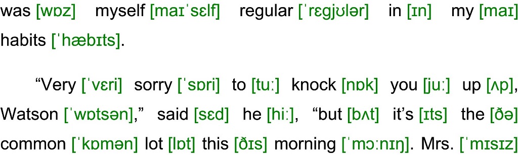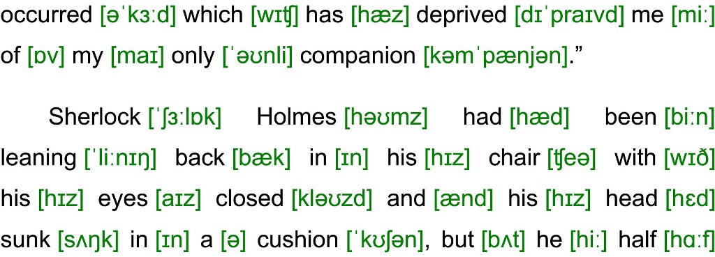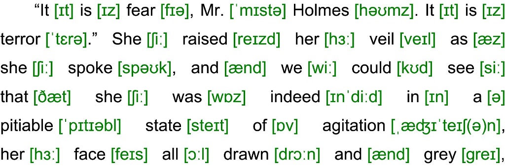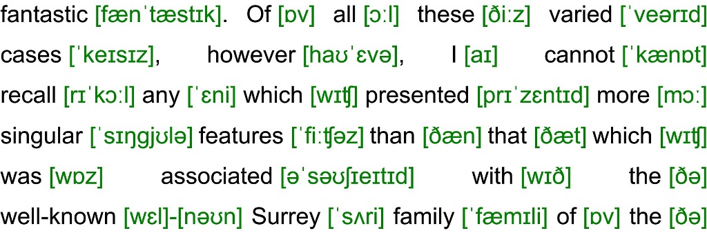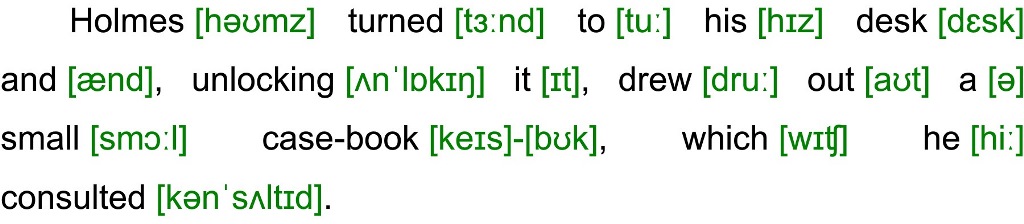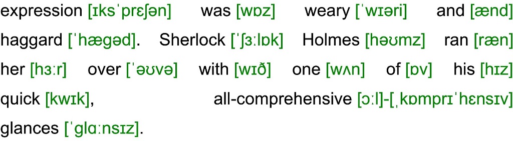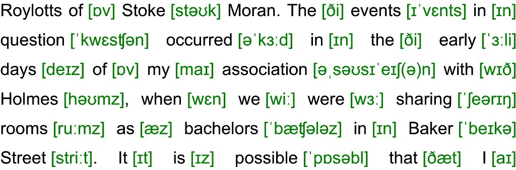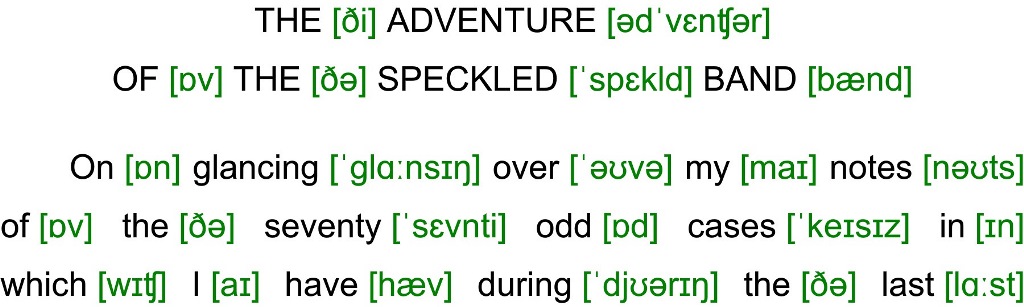 В данной книге приводится транскрипция текста рассказа А.К. Дойла «Приключение пёстрой ленты» на английском языке. Текст рассказа разбит на небольшие фрагменты. Фрагменты пронумерованы порядковыми номерами (01, 02,…,93). После номера фрагмента приведены время начала и окончания аудиозаписи текста фрагмента в аудиокниге. Для каждого фрагмента подготовлена транскрипция текста, оформленная в виде иллюстраций с изображением транскрипции текста фрагмента.