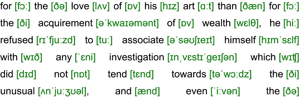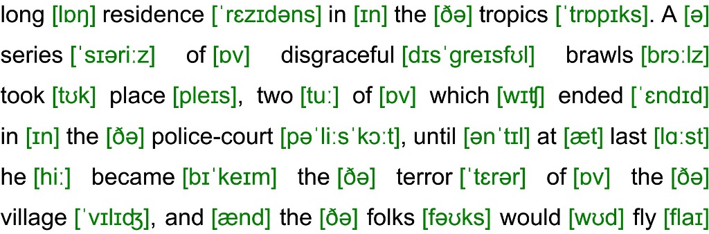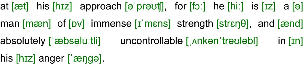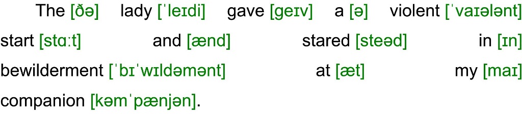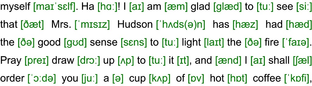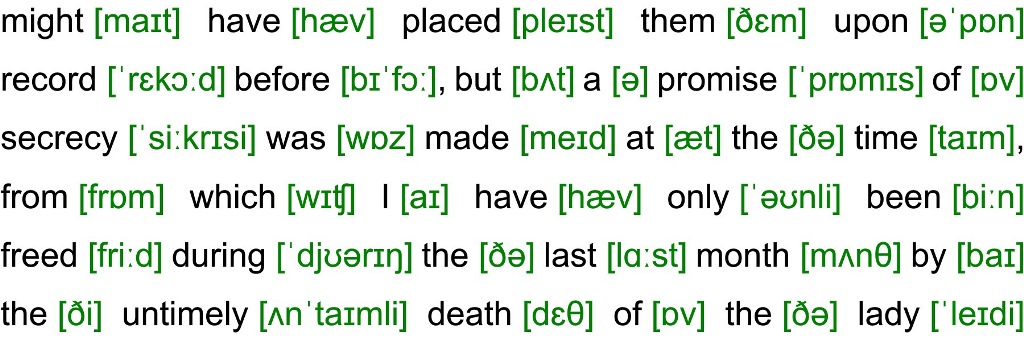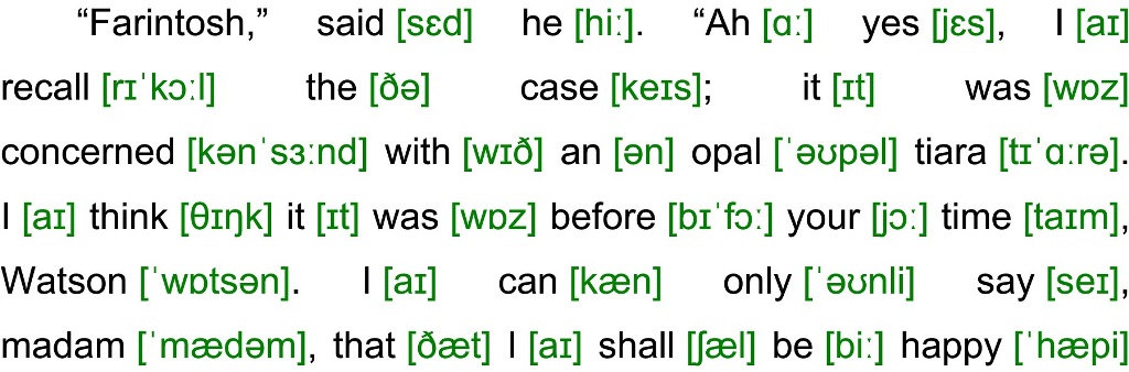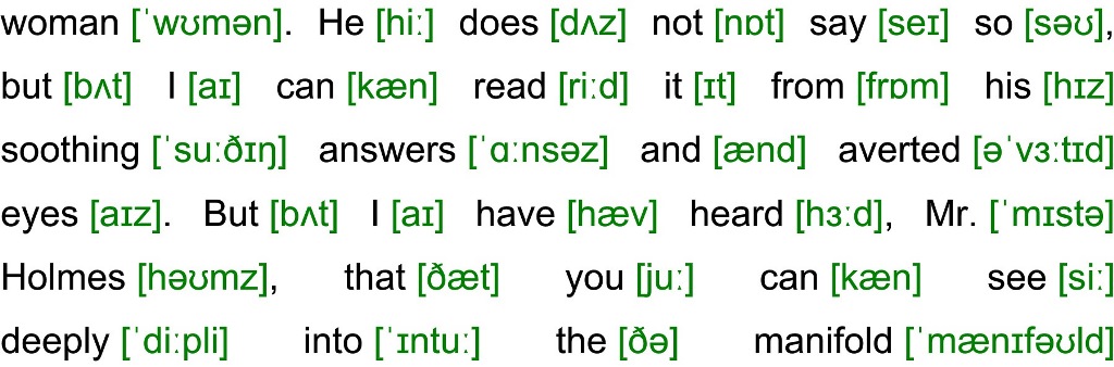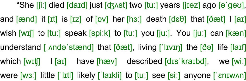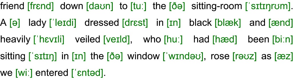 В данной книге приводится транскрипция текста рассказа А.К. Дойла «Приключение пёстрой ленты» на английском языке. Текст рассказа разбит на небольшие фрагменты. Фрагменты пронумерованы порядковыми номерами (01, 02,…,93). После номера фрагмента приведены время начала и окончания аудиозаписи текста фрагмента в аудиокниге. Для каждого фрагмента подготовлена транскрипция текста, оформленная в виде иллюстраций с изображением транскрипции текста фрагмента.
