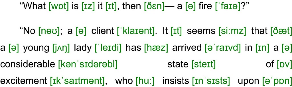 “Good-morning, madam,” said Holmes cheerily. “My name is Sherlock Holmes. This is my intimate friend and associate, Dr. Watson, before whom you can speak as freely as before myself. Ha! I am glad to see that Mrs. Hudson has had the good sense to light the fire. Pray draw up to it, and I shall order you a cup of hot coffee, for I observe that you are shivering.”