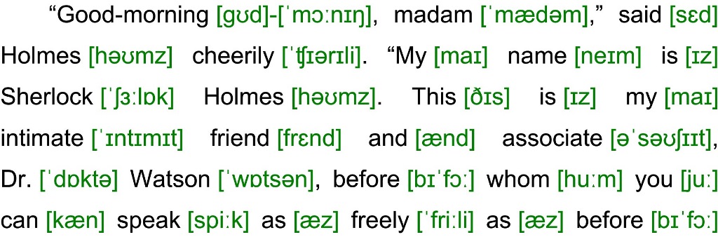 Для подготовки книги использована бесплатная электронная книга с публичного сайта Project Gutenberg (http://www.gutenberg.org/ebooks/1661). Транскрипция, записанная символами международного фонетического алфавита, выполнена с помощью онлайн-переводчика английского текста в транскрипцию – toPhonetics (https://tophonetics.com/ru/). Автор онлайн-переводчика – Дмитрий Янс. Бесплатная аудиокнига с публичного сайта Librivox (https://librivox.org/the-adventures-of-sherlock-holmes-version-4-by-sir-arthur-conan-doyle/) озвучена носителем языка (David Clarke).