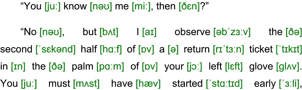 “No, but I observe the second half of a return ticket in the palm of your left glove. You must have started early, and yet you had a good drive in a dog-cart, along heavy roads, before you reached the station.”