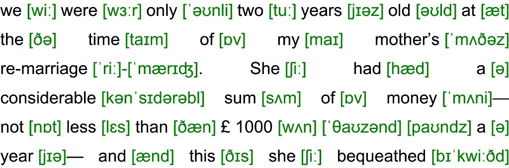 “When Dr. Roylott was in India he married my mother, Mrs. Stoner, the young widow of Major-General Stoner, of the Bengal Artillery. My sister Julia and I were twins, and we were only two years old at the time of my mother’s re-marriage. She had a considerable sum of money—not less than £ 1000 a year—and this she bequeathed to Dr. Roylott entirely while we resided with him, with a provision that a certain annual sum should be allowed to each of us in the event of our marriage. Shortly after our return to England my mother died—she was killed eight years ago in a railway accident near Crewe. Dr. Roylott then abandoned his attempts to establish himself in practice in London and took us to live with him in the old ancestral house at Stoke Moran. The money which my mother had left was enough for all our wants, and there seemed to be no obstacle to our happiness.