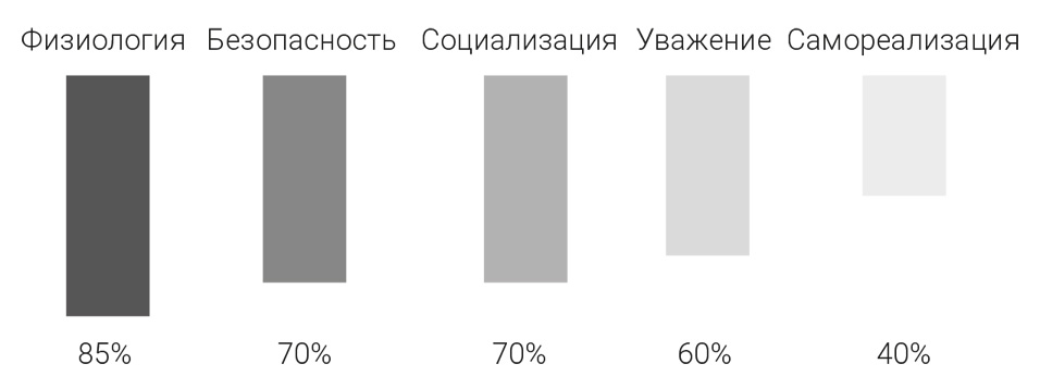 Выйти на новый уровень пирамиды Маслоу можно только после удовлетворения потребностей предыдущего. При этом совершенно не обязательно закрывать потребности на каждой ступени пирамиды на все 100 %. У уровней есть условная граница (иногда выше, иногда ниже), достижение которой позволяет двигаться на следующую ступень.
