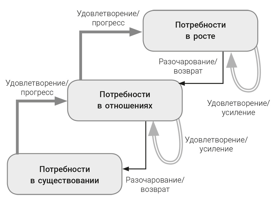 К существованию относятся потребности в безопасности и физическом комфорте. К отношениям – стремление к социализации, необходимость в признании и уважении. К росту – потребности в самосовершенствовании и самореализации. Основное отличие теории ERG от пирамиды Маслоу состоит в движении между потребностями. Оно может осуществляться в любом направлении, то есть для возникновения мотивации к верхним уровням потребностей не обязательно полностью удовлетворять низшие уровни.