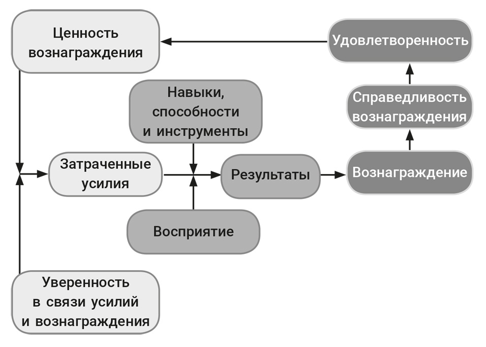Модель состоит из пяти ключевых элементов: усилия, восприятие, результаты, вознаграждение и удовлетворенность. Прилагаемые усилия зависят от ценности и вероятности получения вознаграждения. Восприятие – это субъективная оценка качества работы, за которую можно получить вознаграждение, а также его значимость. Результат – совокупность качества, скорости и полноты выполненных действий. Вознаграждение может быть как внешним (материальные блага, признание, одобрение и поощрения), так и внутренним (самоудовлетворенность, обретение уверенности в собственных силах). Удовлетворенность – это оценка результатов работы и совокупность внутренних и внешних вознаграждений при условии их справедливости.