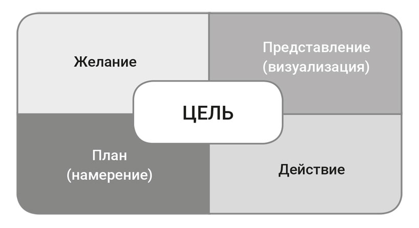 Поэтому Арчи решил максимально просто представить, какие же элементы влияют на формирование и достижение целей. Независимо от уровня и группы потребностей цели, для ее успешного достижения важны четыре элемента: желание, представление (визуализация), планирование (намерение) и действие (реализация).