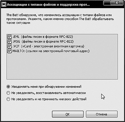 1. В первом же окне, которое вы увидите после запуска (рис. 2.59), появится предупреждение о том, что программа хочет закрепить за собой ассоциации с типами некоторых файлов. Если вы собираетесь использовать этот мэйлер и далее – лучше принять это любезное предложение и выбрать пункт Уведомлять меня при обнаружении изменений. Так The Bat будет знать, что какая-то другая программа нагло перетянула одеяло на себя, и предложит в таком же окне вернуть все обратно. Нажмите после выбора кнопку ОК.