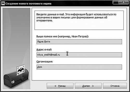 6. После нажатия кнопки Далее вы попадете в следующее окно. Там (рис. 2.62) нужно будет указать ваше имя, адрес e-mail и название организации (если она у вас есть и вам нужны эти данные) – все это будет отображаться в ваших письмах. Когда вы заполните нужные вам поля – Далееждет вас.