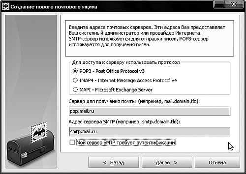 7. После этого вам нужно вписать информацию о серверах входящей и исходящей почты (POP3 и SMTP соответственно) – точно так же, как мы это делали раньше (рис. 2.63). И снова мы нажимаем Далее.