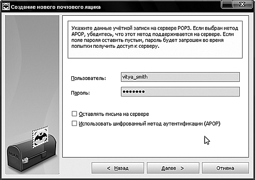 8. В следующем диалоговом окне вы должны будете указать логин и пароль, которые придумали при создании почтового ящика на нужном вам сервисе (рис. 2.64), и нажать кнопку Далее.