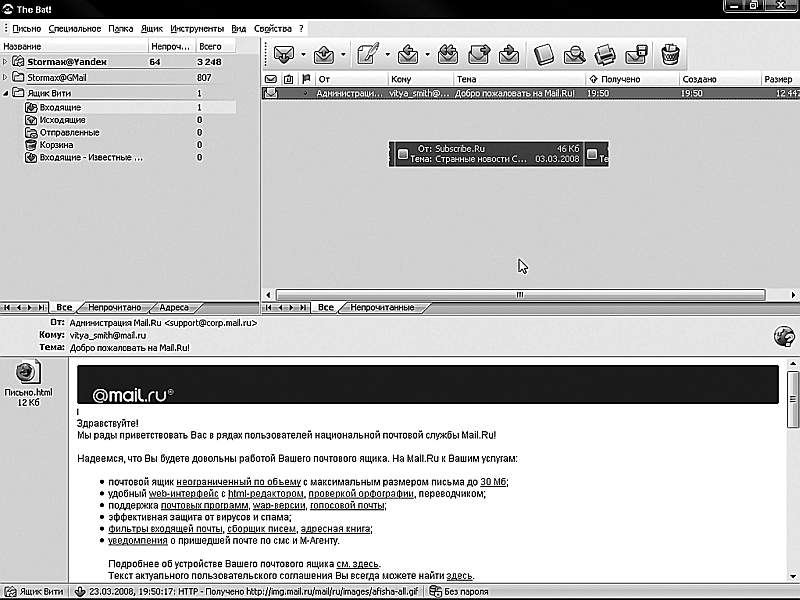 Итак, наконец-то программа загрузилась, и вы видите ее главное окно. Структура, как понятно из рис. 2.66, совершенно стандартна: нижнюю часть занимает окно просмотра письма, правую – список сообщений и левую – список папок. И над всем этим плавает фирменная «фишка» The Bat! – черная полоска с названием Mail Ticker, которая предназначена для оповещения о поступлении новых писем и/или наличии непрочитанных.