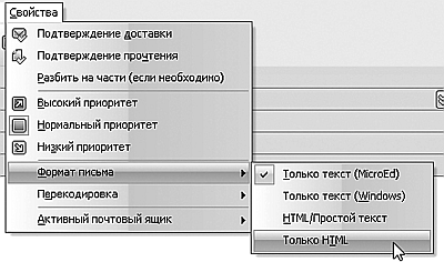 3. Вы можете менять вид сообщения: оформить его либо как просто текст, либо в виде HTML. В последнем случае можно экспериментировать с текстом письма с помощью появляющейся панели форматирования, расположенной над окном ввода текста. Меняется формат письма с помощью меню Свойства =>Формат письма (Options => Message format) (рис. 2.70).