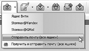 5. Если вы написали несколько писем и положили их в папку Исходящие, то их надо отправить. Для этого нажмите на панели инструментов главного окна стрелку справа от кнопки Отправить письма в очереди. Если вы хотите только отправить почту, но ничего не принимать, воспользуйтесь контекстным меню данной кнопки и выберите в нем пункт Отправить почту (все ящики) (рис. 2.72).