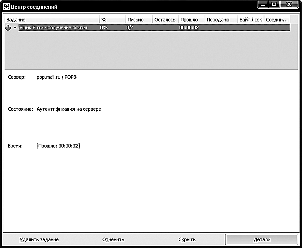 Во время приема или отправки почты вы можете видеть диалоговое окно, изображенное на рис. 2.73. Оно разделено на три части: в верхней вы видите краткую сводную статистическую таблицу, ниже – детализированную, и в самом низу окна есть четыре кнопки: Удалить задание (отменяет прием или отправку почты с одного ящика), Отменить (отменяет и прием, и отправку почты со всех ящиков), Скрыть (убирает это диалоговое окно, не прерывая процесса) и Детали (отображение детализированной статистической таблицы).