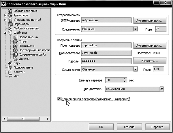 2. Откроется одноименное окно (рис. 2.74). Как видите, оно состоит из множества разделов слева и опций в правой части окна. Сразу обычно открывается раздел Транспорт (Transport), нас он в данном случае не интересует. Хотя вы можете поставить очень полезный флажок Совмещенная доставка (получение + отправка): при нажатии на кнопку Получить новую почту или Отправить письма в очереди будут выполняться сразу оба действия.