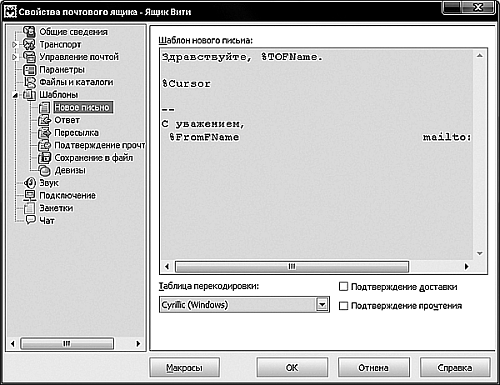 Откроем для примера окно создания шаблона нового письма. На рис. 2.76 вы видите шаблон, созданный по умолчанию в поле Шаблон нового письма. В списке Таблица перекодировкивы выбираете кодировку вновь создаваемого письма. Для обеспечения максимальной совместимости рекомендуется установить Cyrillic (Windows) или Cyrillic (KOI-8R). Если вы поставите флажок Подтверждение доставки, то вам будет приходить сообщение о доставке письма на почтовый ящик адресата. Еcли поставите второй – Подтверждение прочтения, то вам придет уведомление от получателя о том, что письмо прочитано. Справедливости ради следует сказать, что ставить флажок на втором пункте – задача довольно бессмысленная, потому что если в первом случае сообщение автоматически генерируется почтовым сервером, то во втором – самим пользователем, который вполне может этого и не сделать по разным причинам (например, ему лень, или просто из природной вредности).