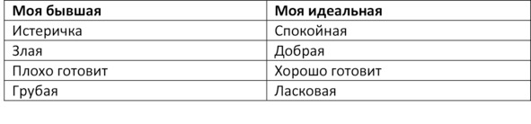 2. Во второй столбик под названием «Моя идеальная» напиши противоположные значения негативных черт характера своей бывшей или те значения, которые для тебя наиболее предпочтительны. Например, если ты написал «истеричка», значит, во втором столбце напротив «истерички» пиши «спокойная» или «рассудительная».